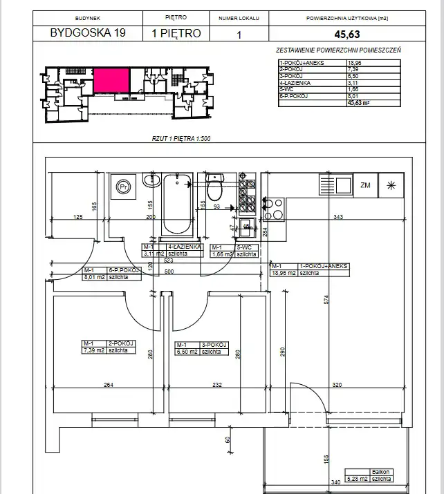 - Charakterystyka mieszkania 45.63 m2, 3 pokoje