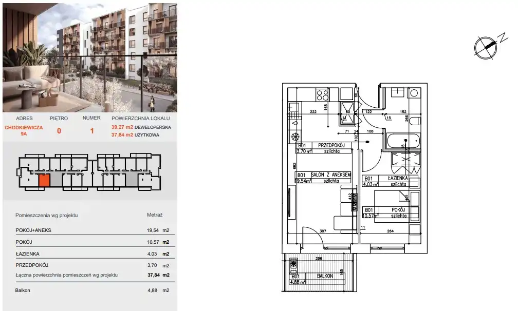 - Charakterystyka mieszkania 37.84 m2, 2 pokoje