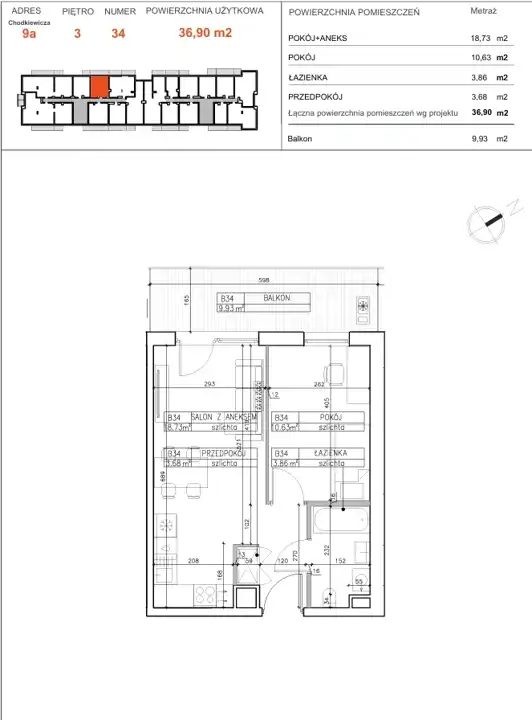 Powierzchnia użytkowa o metrażu 36,90 m² obejmuje: