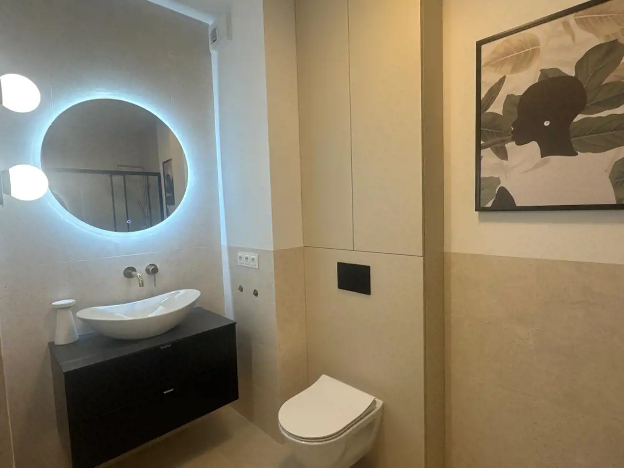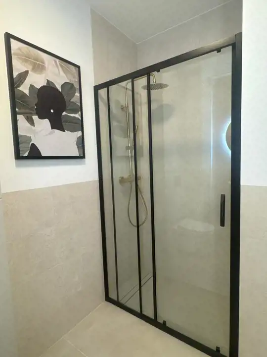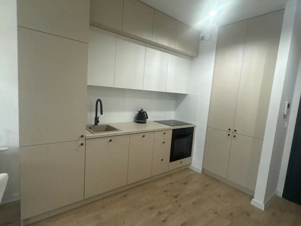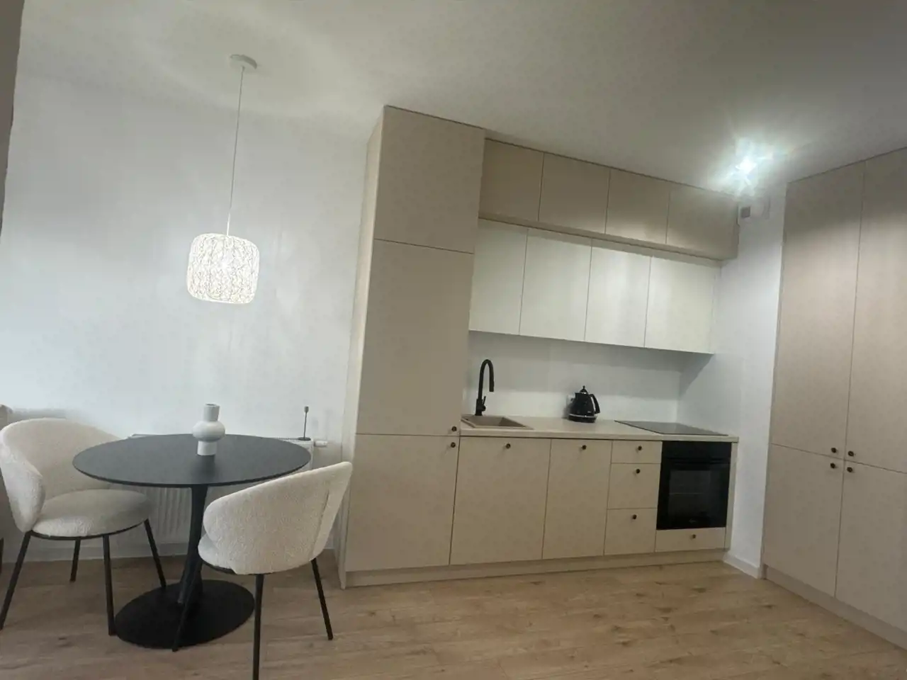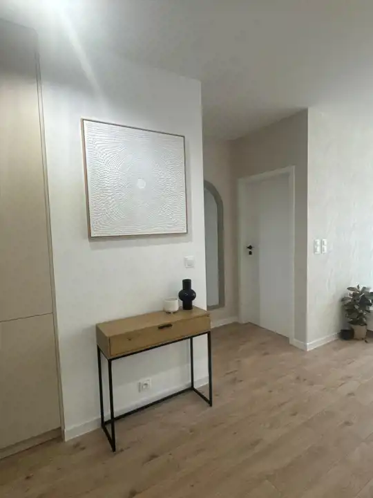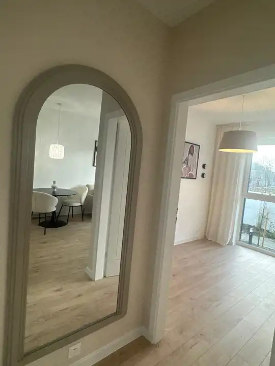 Gustownie urządzona kuchnia z duża ilością szafek, wyposażona jest w sprzęt AGD (piekarnik, płyta indukcyjna, okap, lodówka-zamrażarka, zmywarka) doskonale komponuje się z otwartym salonem, w którym znajduje się wygodna rozkładana kanapa, stolik i komoda z miejscem na telewizor co tworzy przytulne nowoczesne wnętrze. Sypialnia została zabudowa dużą szafą . Nowoczesna łazienka wyposażona jest w prysznic z deszczownicą oraz meble łazienkowe, duże gresowe płytki, baterie podtynkowe, podwieszane wc. W korytarzu zamontowano dużą szafę, konsolę oraz duże lustro, które stanowią spójną zabudowę z resztą pomieszczeń. Podłogi w mieszkaniu są w jednolitym drewnianym kolorze. Mieszkanie jest jasne, przestronne, ma duże panoramiczne okna gwarantują mnóstwo światła.