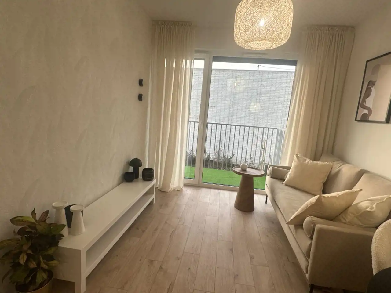 Mieszkanie nowe nieużywane, gotowe do zamieszkania. Meble widoczne na zdjęciach są w cenie mieszkania. Balkon wykończony zieloną trawą.