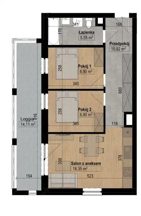 - Charakterystyka mieszkania 54.89 m2, 3 pokoje