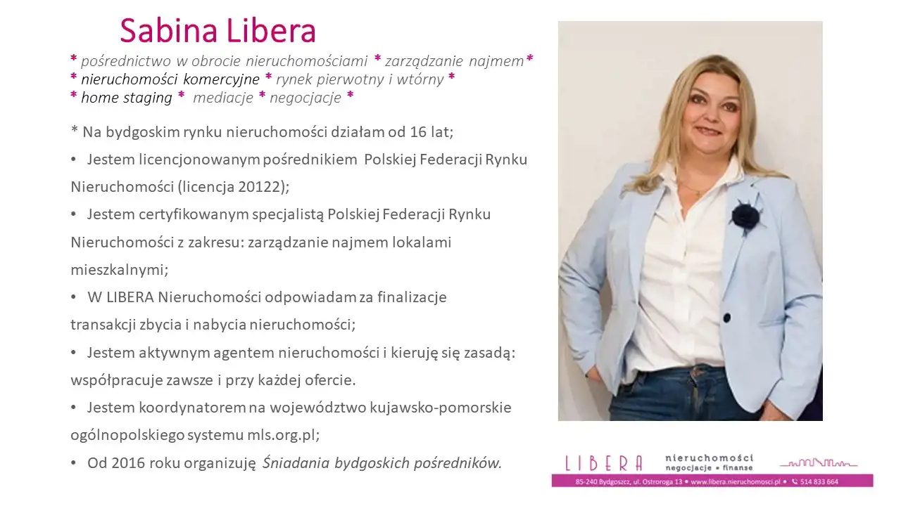 LIBERA Nieruchomości Sabina Libera – jestem członkiem Polskiej Federacji Rynku Nieruchomości (PFRN), Wielkopolskiego i Warszawskiego Stowarzyszenia Pośredników w Obrocie Nieruchomościami (WSPON).