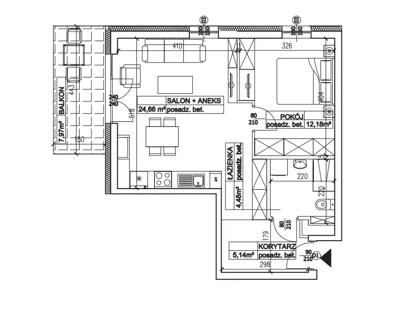 * pokoju dziennego z aneksem kuchennym (24,66m2),