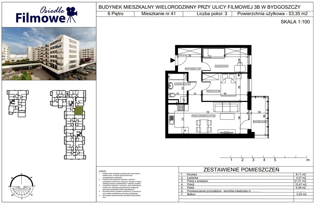 - Charakterystyka mieszkania 53.35 m2, 3 pokoje