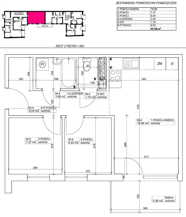 - Charakterystyka mieszkania 45.58 m2, 3 pokoje