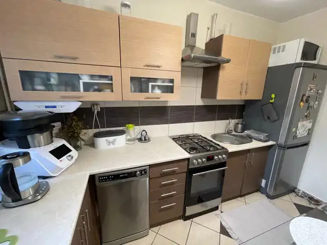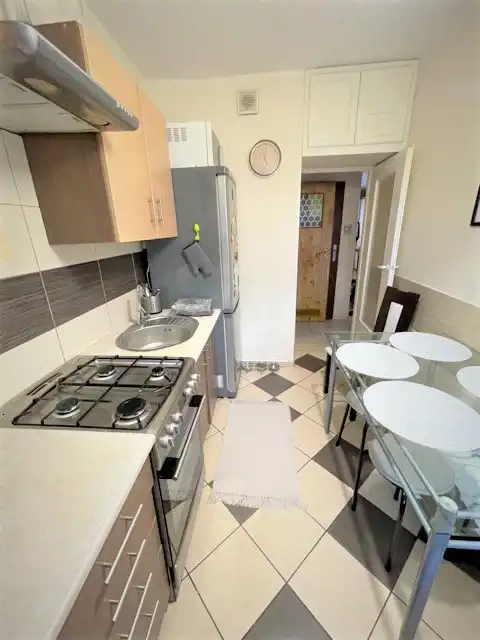 Kuchnia o pow. 8m2. - większe okno, meble przyjemne, nowy pochłaniacz pary, kuchenka dobra gazowa z piekarnikiem.