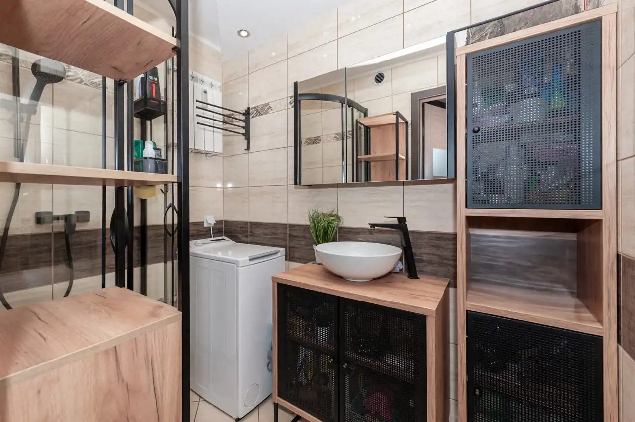W łazience nowoczesne meble w stylu loftowym. Oddzielna toaleta cała w glazurze.