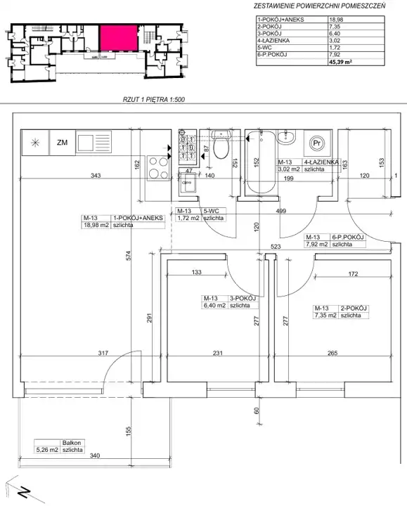 - Charakterystyka mieszkania 45.39 m2, 3 pokoje