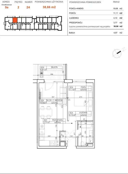 - Charakterystyka mieszkania 38.66 m2, 2 pokoje