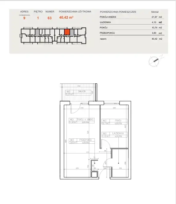 Powierzchnia użytkowa o metrażu 40,42 m² obejmuje: