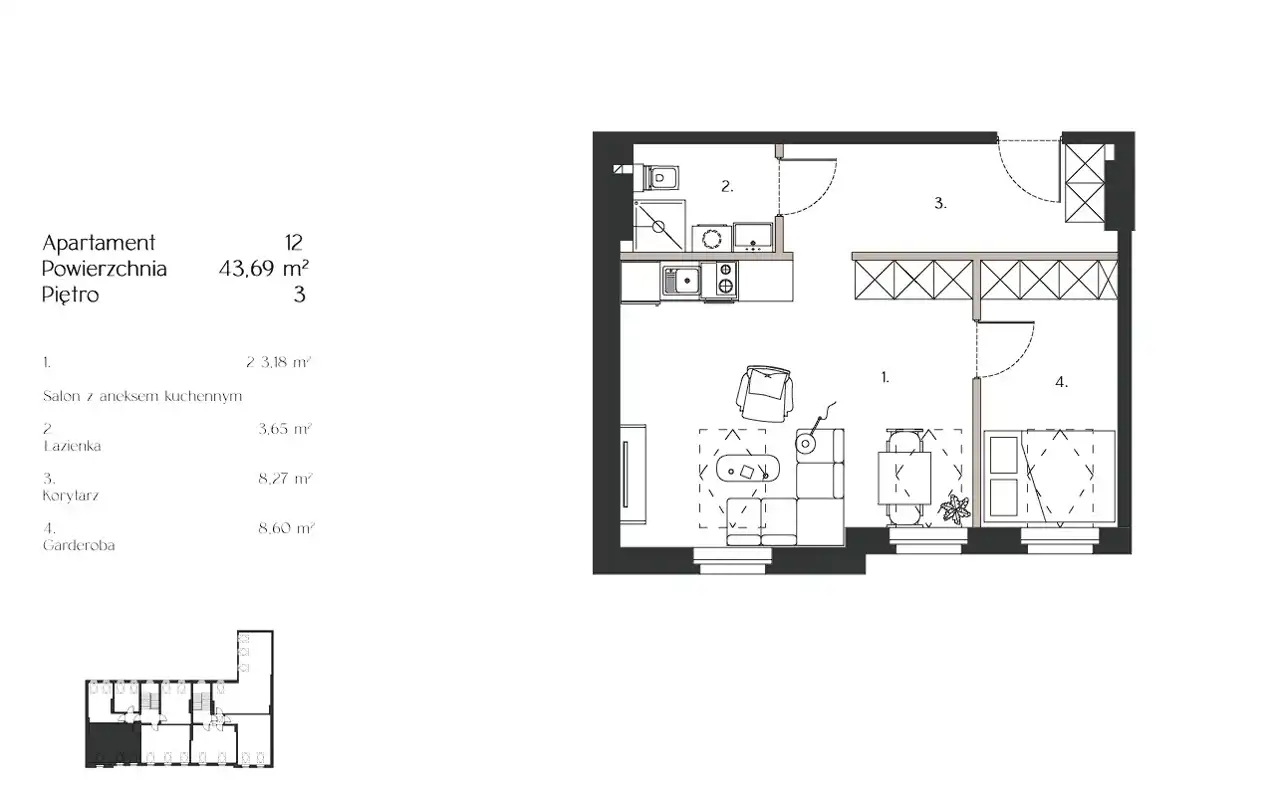 Układ składa się z salonu z aneksem kuchennym, sypialni i łazienki.