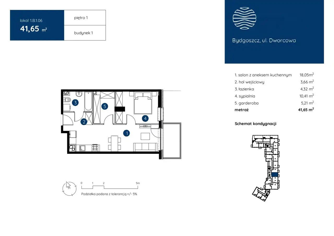 Prezentowane mieszkanie o powierzchni 41,65 m2 składa się z: