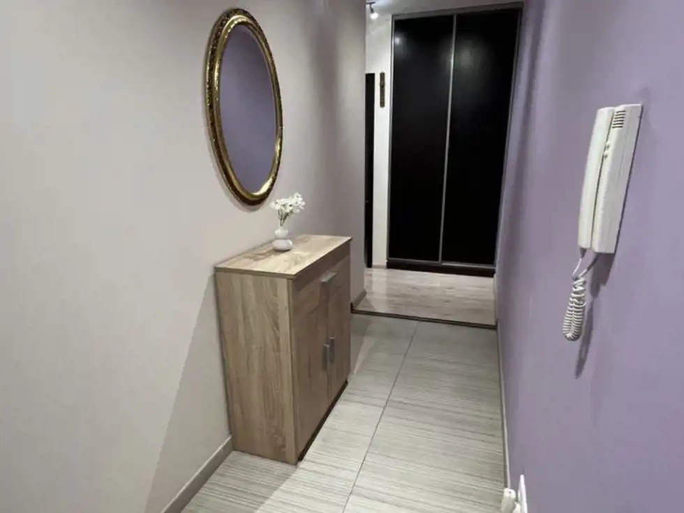 Wnętrze utrzymane jest w jasnej, harmonijnej kolorystyce, z subtelnymi fioletowymi akcentami, które dodają elegancji i świeżości. Duże okna sprawiają, że mieszkanie jest jasne i słoneczne przez cały dzień.