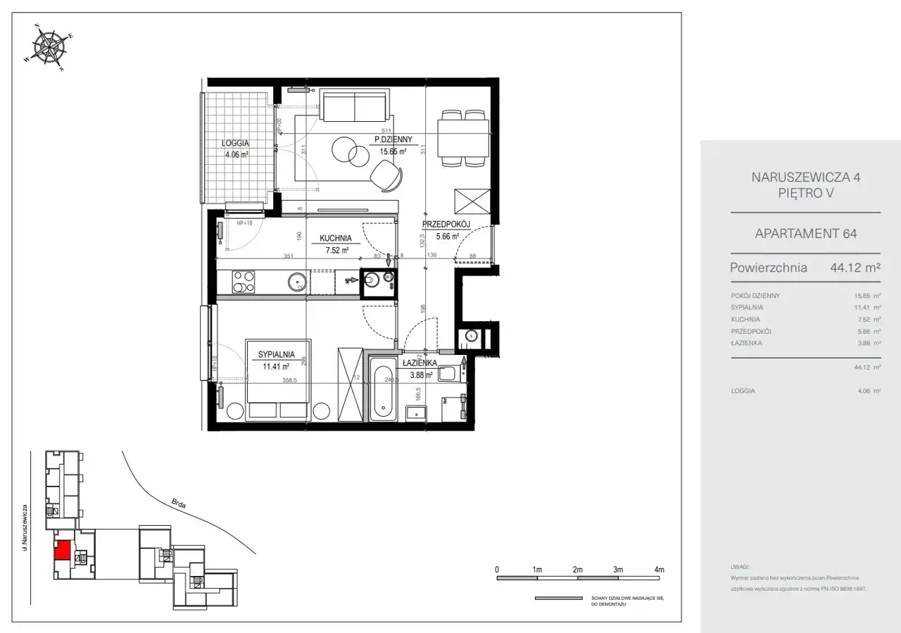 - Charakterystyka mieszkania 44.12 m2, 2 pokoje