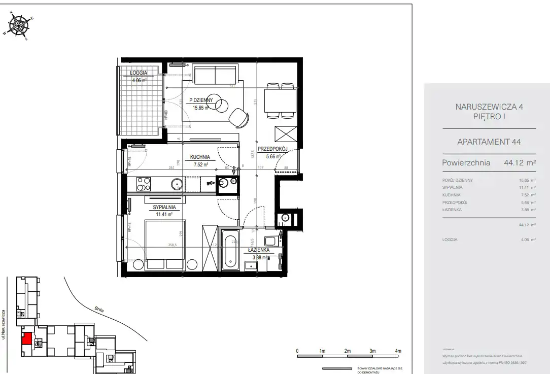 - Charakterystyka mieszkania 44.12 m2, 2 pokoje