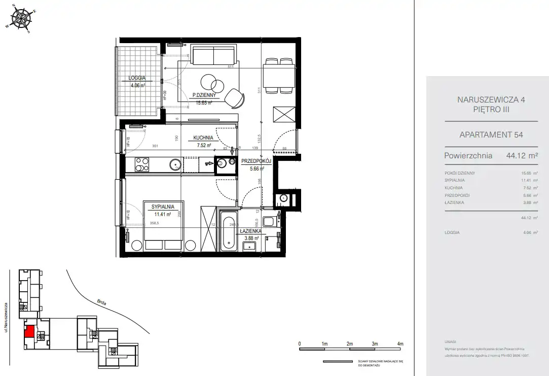 - Charakterystyka mieszkania 44.12 m2, 2 pokoje