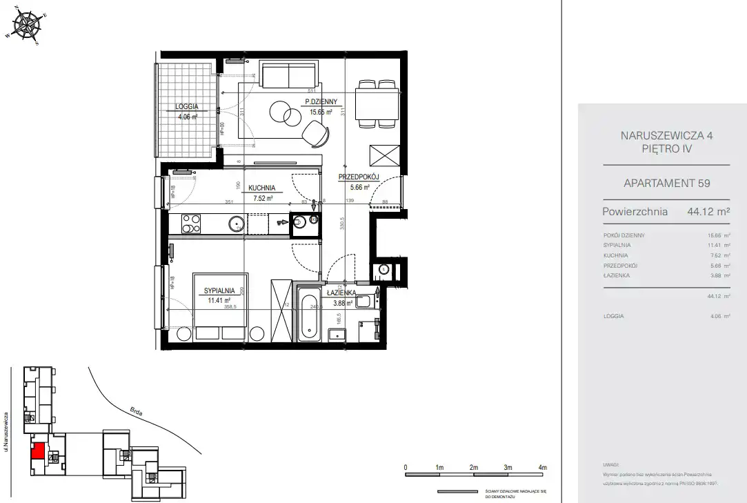 - Charakterystyka mieszkania 44.12 m2, 2 pokoje