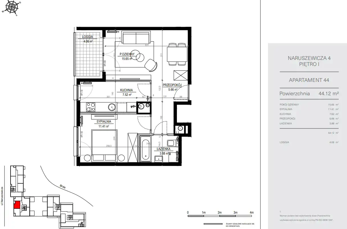 - Charakterystyka mieszkania 44.12 m2, 2 pokoje