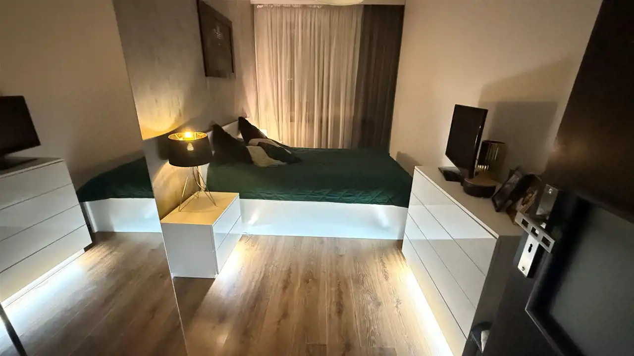 Całość została wykończona w wysokim standardzie, z dbałością o detale i spójność stylistyczną. Zabudowy wykonane na wymiar, nowoczesne oświetlenie – w tym klimatyczne LED – oraz dobrej jakości materiały sprawiają, że mieszkanie nie wymaga żadnych nakładów finansowych. To typ nieruchomości, do której wchodzisz i po prostu zaczynasz mieszkać.
