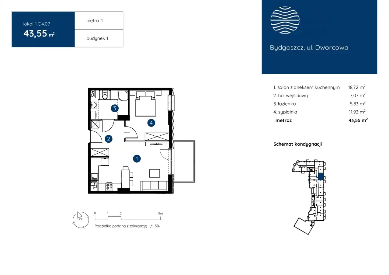 Prezentowane mieszkanie o powierzchni 43,55 m2 składa się z:
