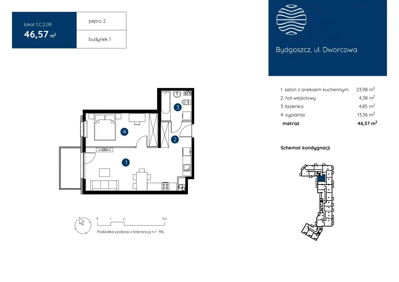 - Charakterystyka mieszkania 46.57 m2, 2 pokoje