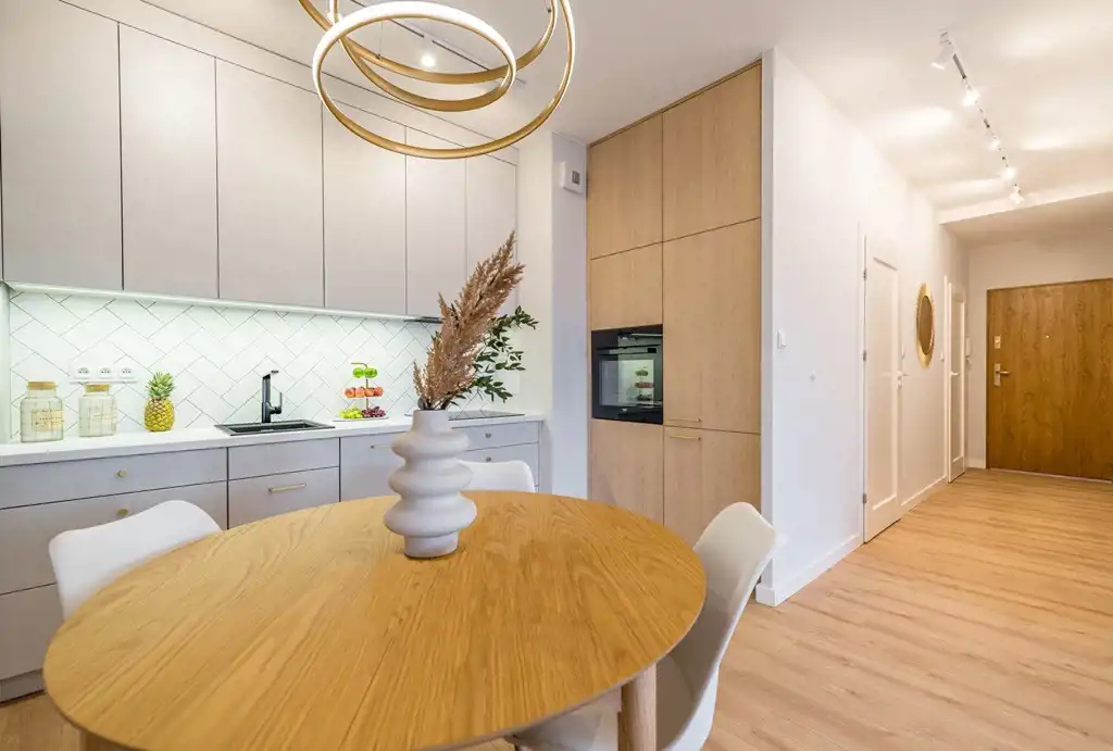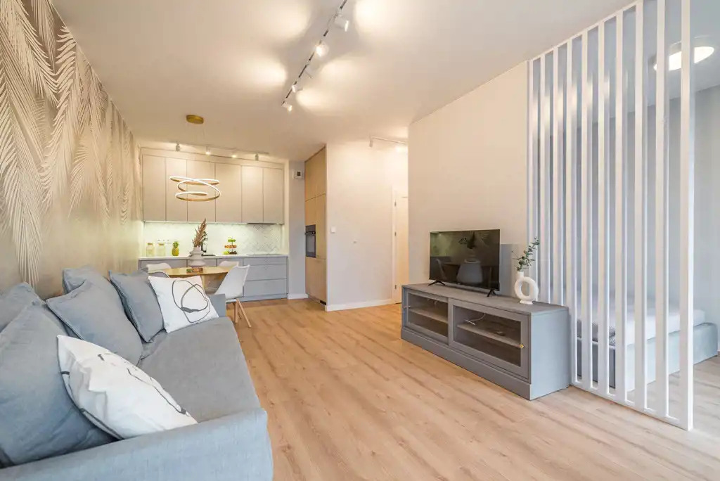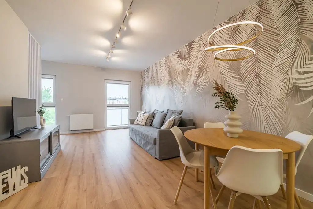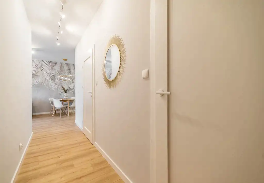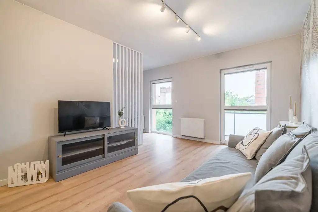 Mieszkanie do wprowadzenia, wyremontowane z dbałością o najdrobniejsze szczegóły. Zabudowa kuchenna z lakierowanymi frontami, sprzęt AGD (płyta indukcyjna, zmywarka, piekarnik, lodówka), drzwi marki Porta, modne oświetlenie sterowane pilotem.