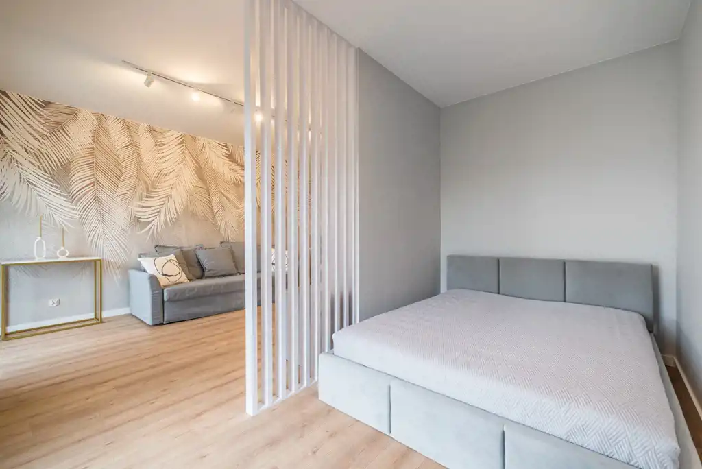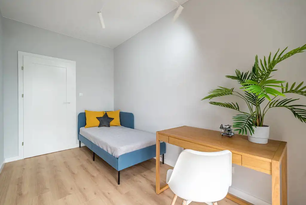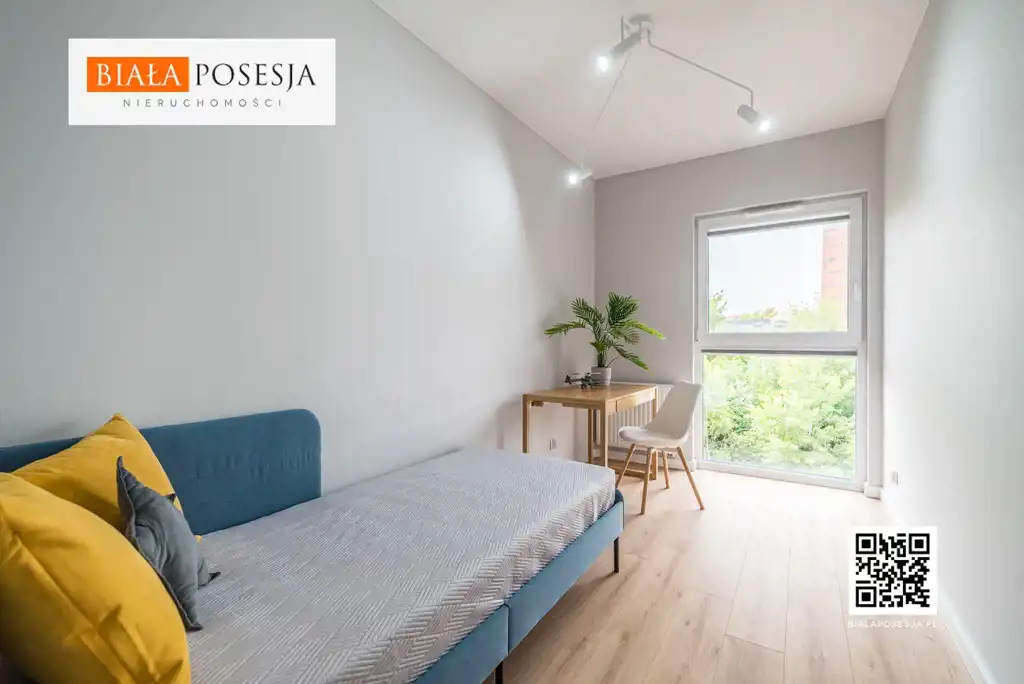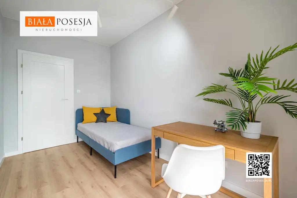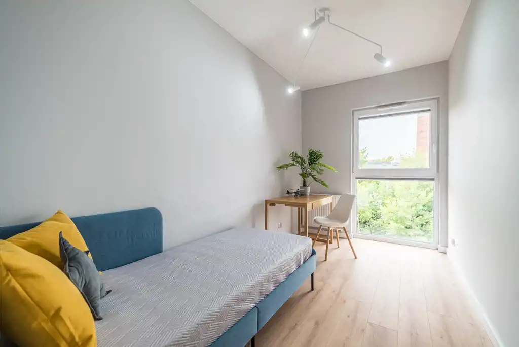 Lokal o powierzchni 55 m2, położony na 2 piętrze, w skład którego wchodzi słoneczny salon z aneksem kuchennym (24 m2) z wyjściem na balkon oraz aneksem sypialnianym (7 m2), pokój (9 m2), przedpokój z garderobą (9 m2), oraz łazienka (4,5 m2).