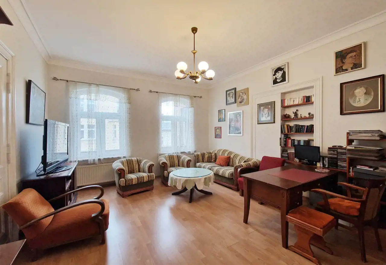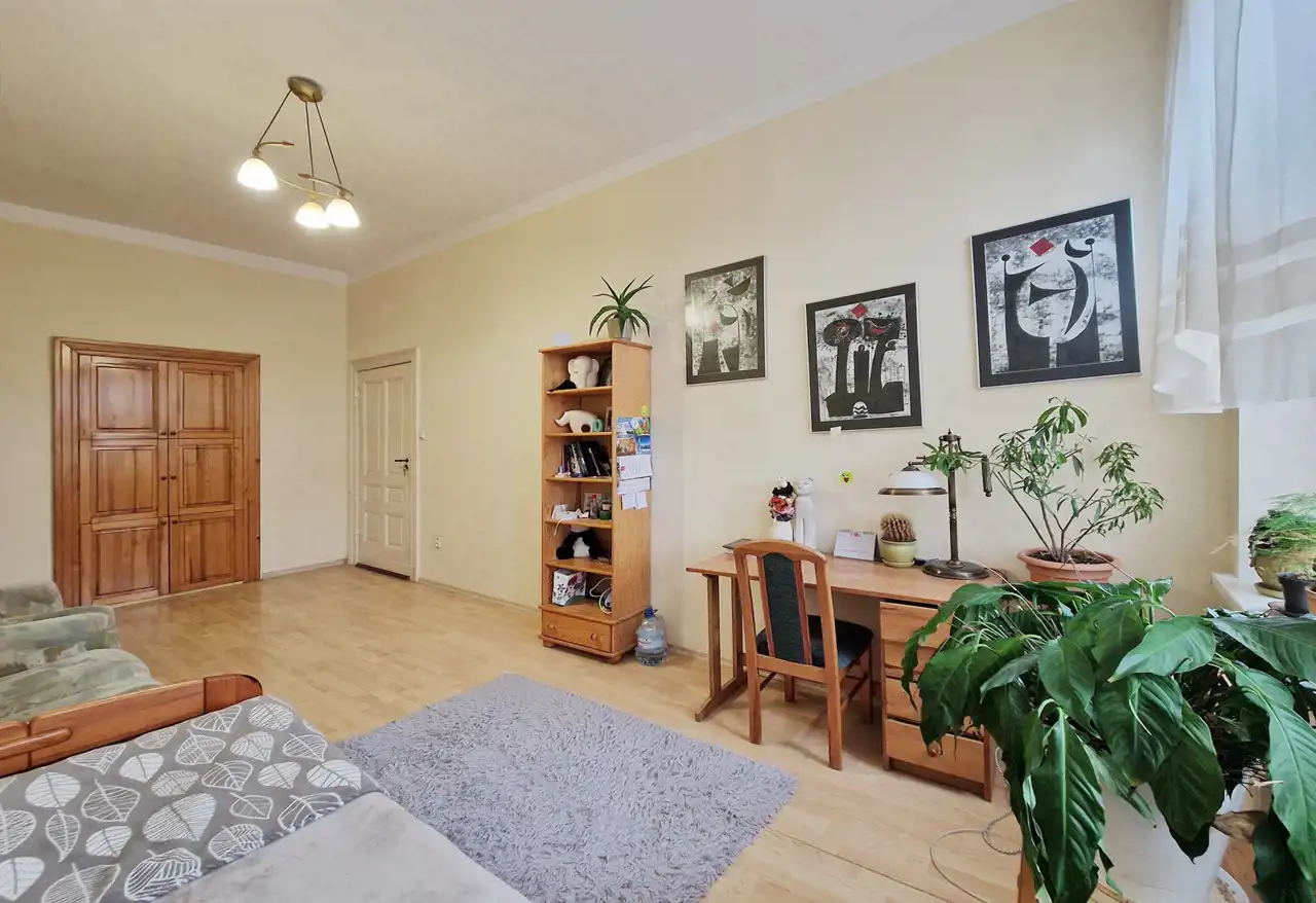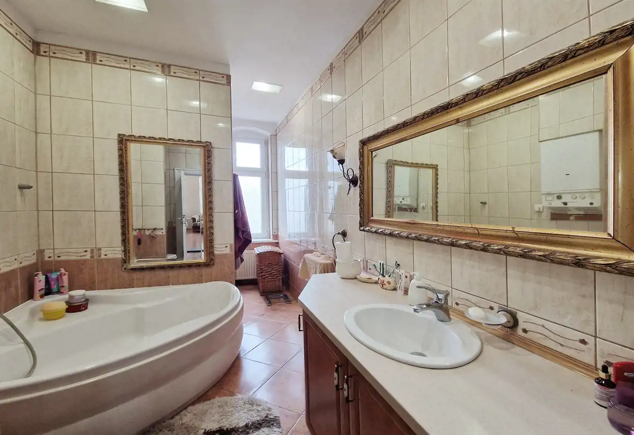 Apartament jest w pełni wyposażony i gotowy do zamieszkania. Przepięknie zaaranżowana przestrzeń w pełni koresponduje z klasycznym urokiem kamienicy. Wpływ na to mają zachowane oryginalne detale architektoniczne, takie jak sztukateria na sufitach, drewniana stolarka drzwiowa, wielkie okna i wykusze oraz wysokość pomieszczeń na poziomie ok. 3,8 m. Podłogi pokryto panelami. Za ciszę i komfort cieplny odpowiadają wielkie okna. Wschodnia orientacja i ich wielkość powoduje, że mieszkanie jest pięknie doświetlone. Całość dopełnia funkcjonalne i piękne wyposażenie – nowe meble wraz z antykami, a także sprzęt AGD, które zapewniają wygodę użytkowania.