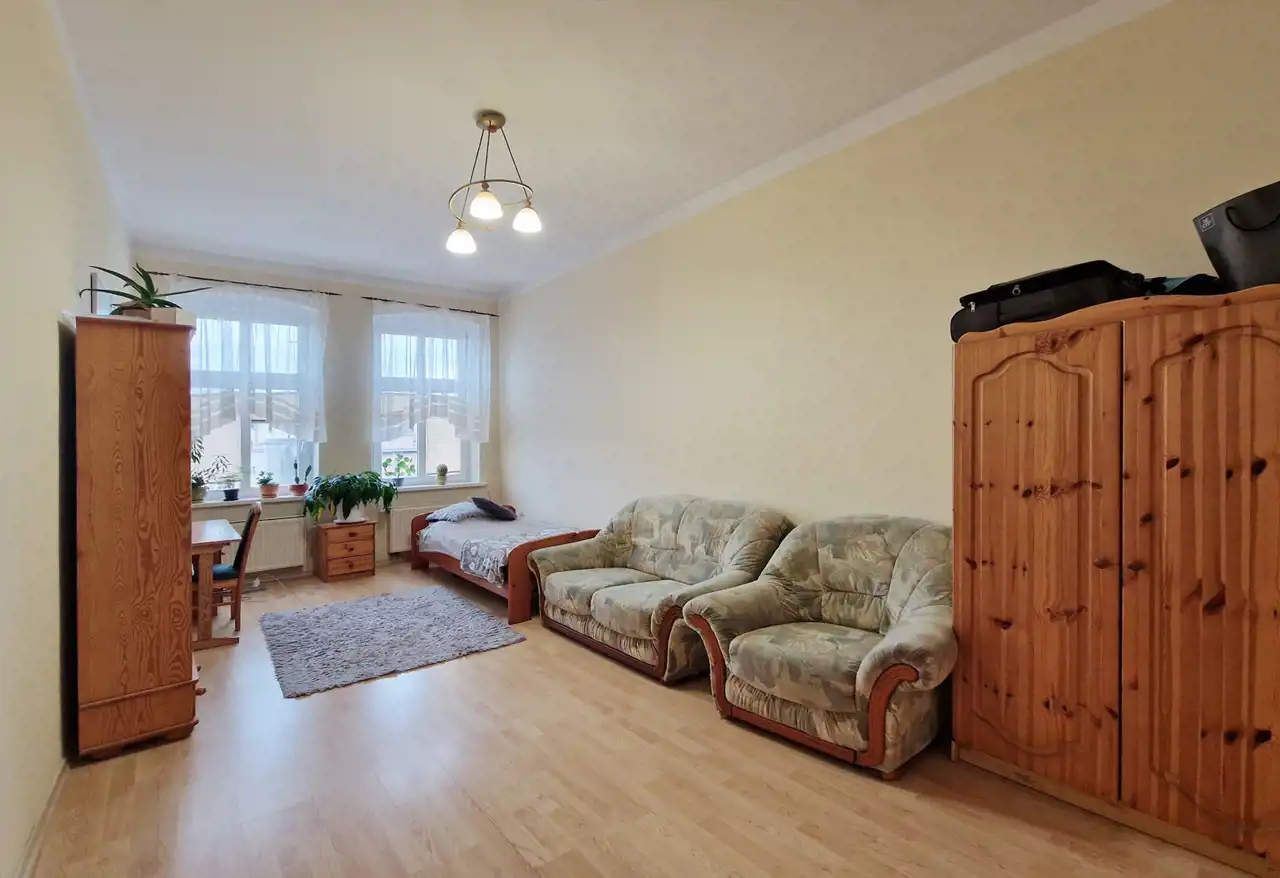 - duży pokój dzienny z pięknymi oknami, oryginalnym piecem kaflowym