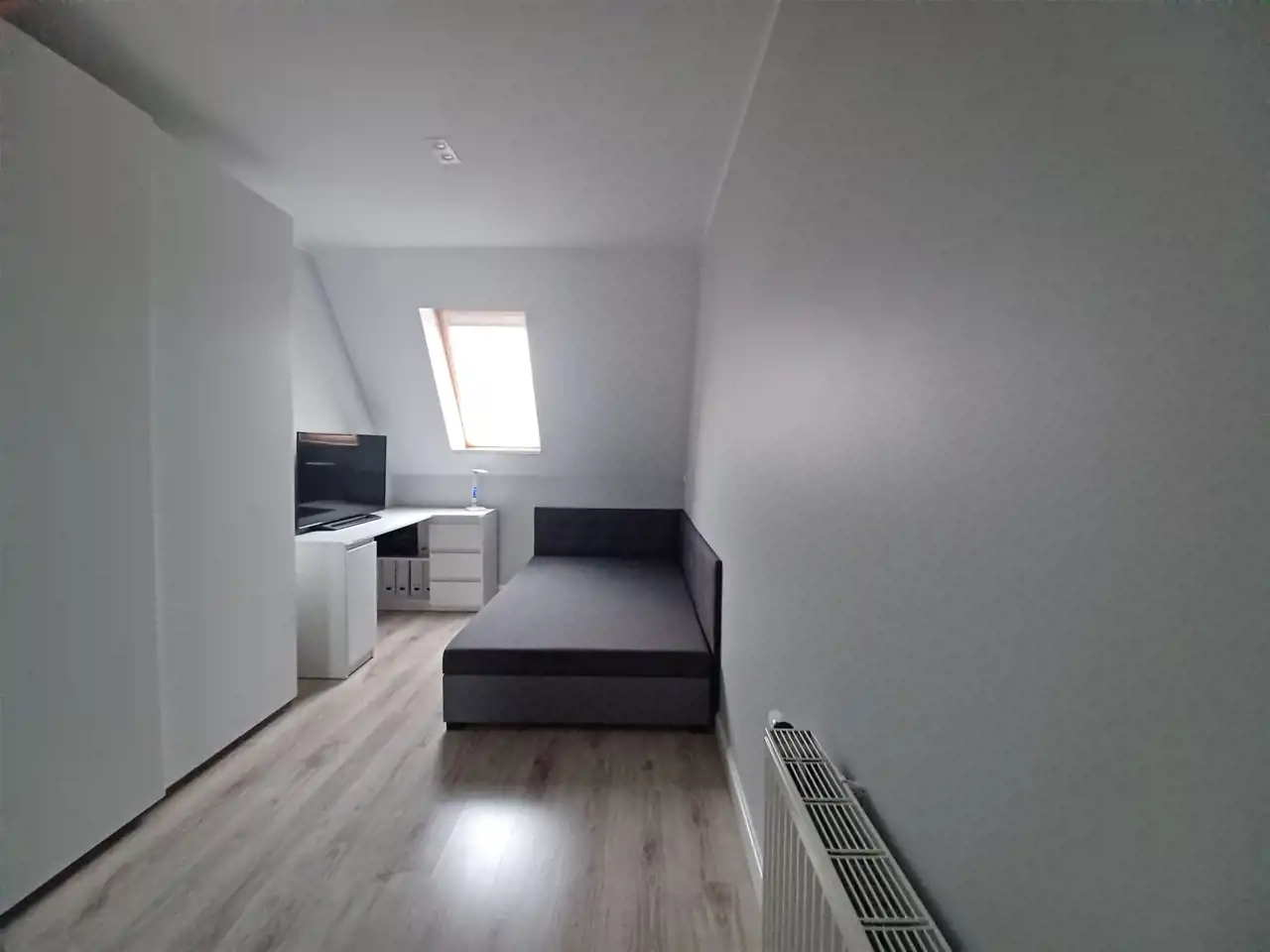 Podłogi – panele podłogowe w pokojach, terakota w łazience, korytarzu i aneksie kuchennym.
