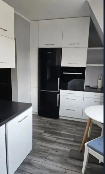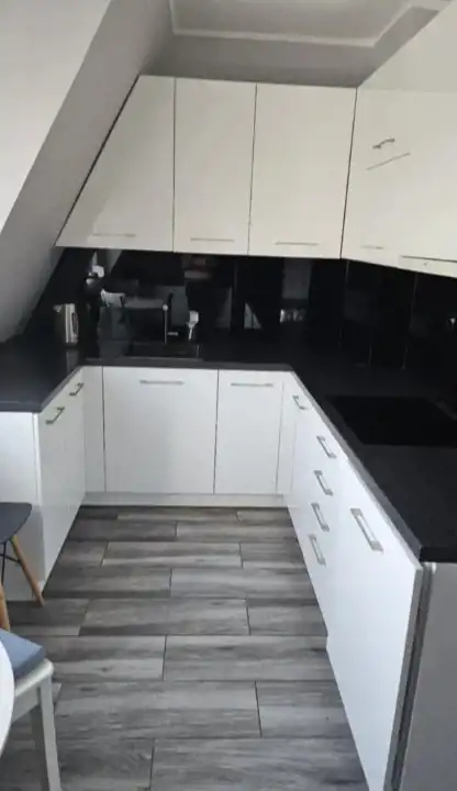 W kuchni bardzo dobrej jakości meble na wymiar z kompletnym wyposażaniem (piekarnik, płyta grzewcza, lodówka, zmywarka i pralka).