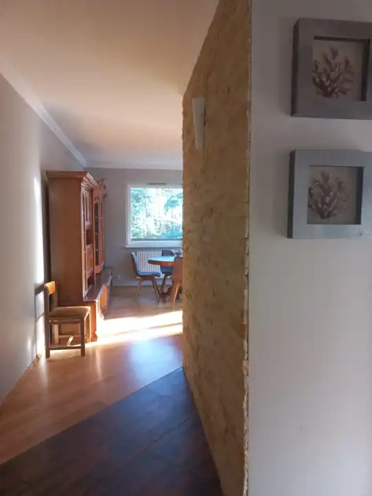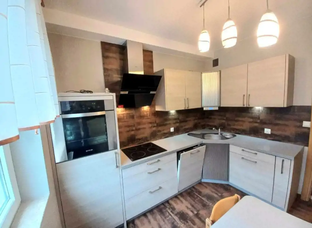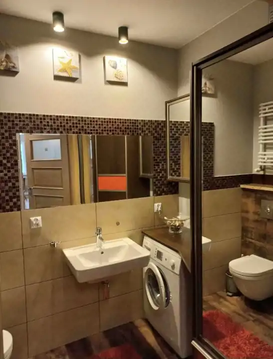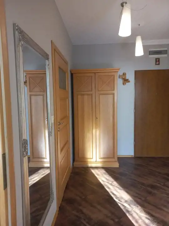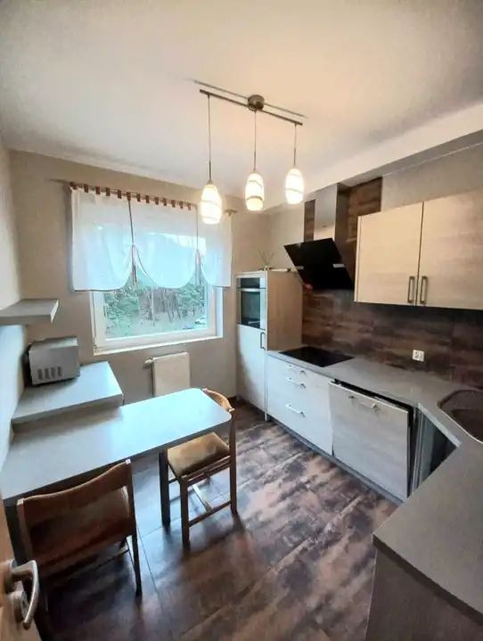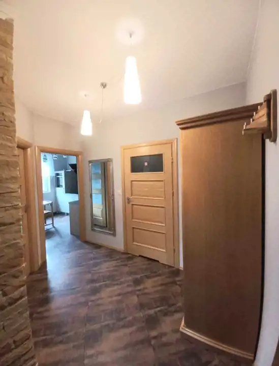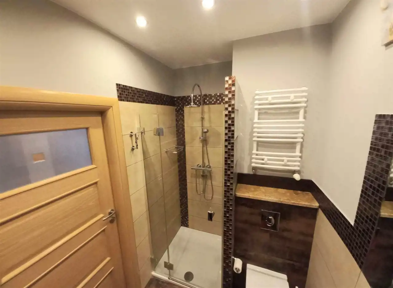 Oddzielna jasna kuchnia z oknem, zabudowa kuchenna wraz ze sprzętem AGD. Łazienka z kabiną prysznicową, pralką automatyczną oraz zabudową. Przedpokój z tworzącą klimat mozaiką z naturalnego piaskowca oraz szafą dwu-drzwiową .