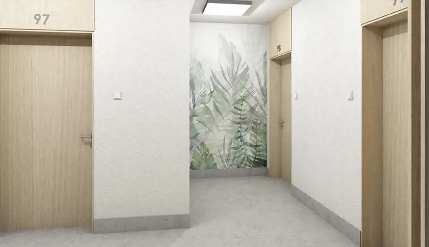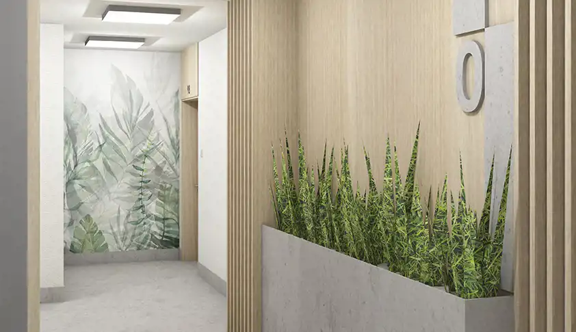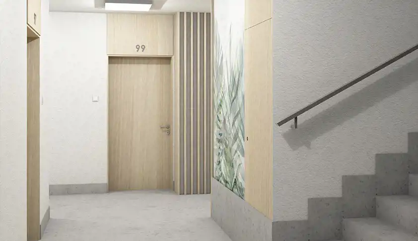 Wewnątrz budynku zadbano o każdy szczegół. Stylowe wykończenie części wspólnych z użyciem elementów dekoracyjnych w postaci motywów roślinnych i drewnianych nadają niepowtarzalnego, ciepłego i przyjaznego charakteru.