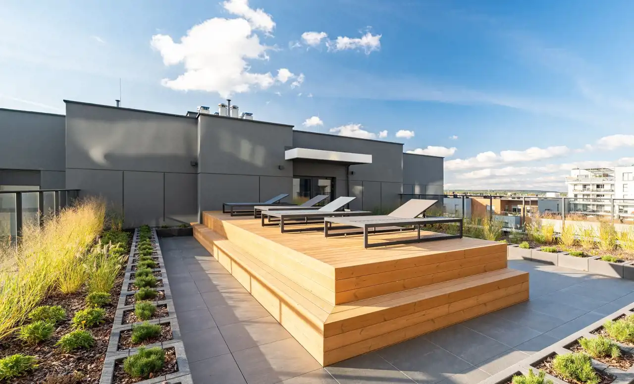 • zielony taras na dachu z leżakami