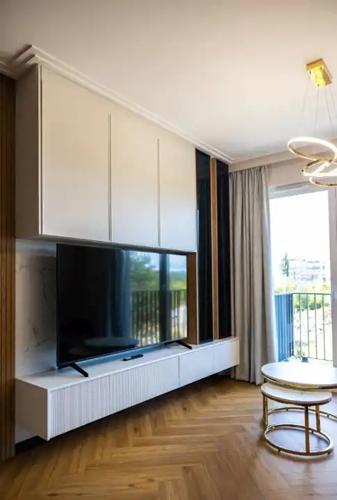 - salon: indywidualnie wykonana sofa z funkcją spania, witryny podświetlane automatycznie, TV 65". -sypialnia z łożem małżeńskim, szafy wg indywidualnego projektu, wykonane na zamówienie;