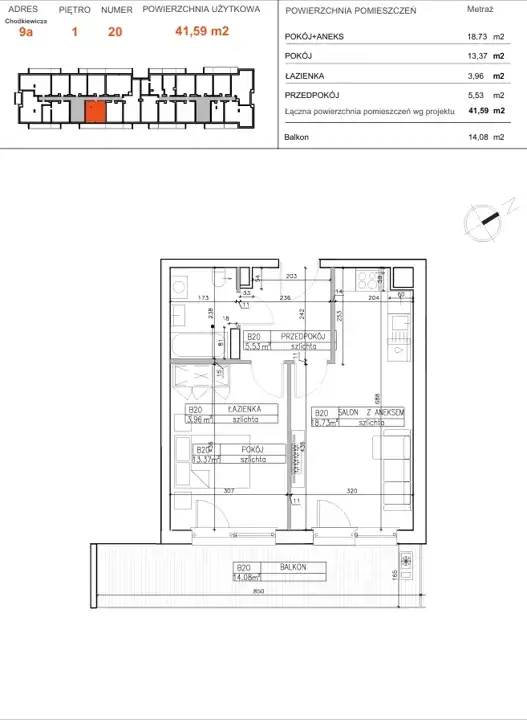 - Charakterystyka mieszkania 41.59 m2, 2 pokoje