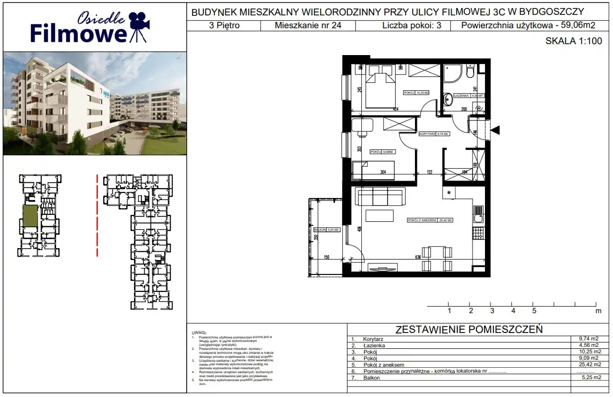 Oferta dotyczy mieszkania znajdującego się w budynku przy ul. Filmowej 3C. Budynek wyróżnia się kaskadową formą — w najwyższym punkcie posiada 8 kondygnacji, natomiast druga część jest niższa i obejmuje 4 piętra. W całym obiekcie znajduje się łącznie 75 mieszkań.