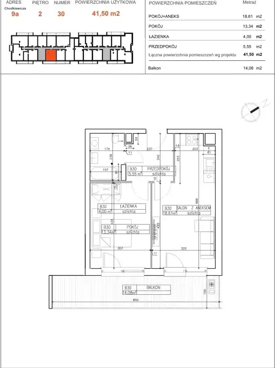 Powierzchnia użytkowa o metrażu 41,50 m² obejmuje: