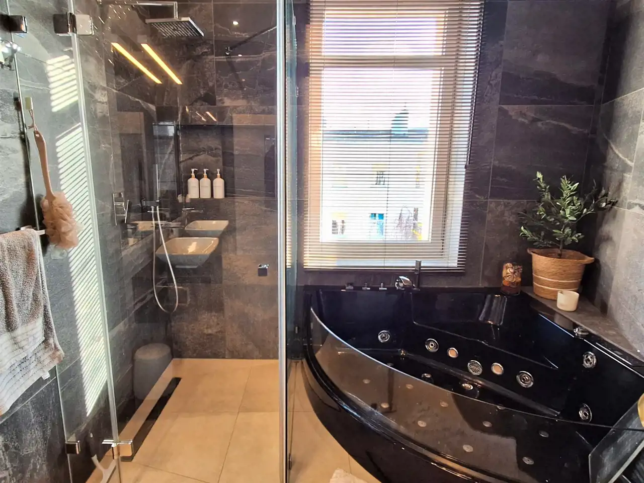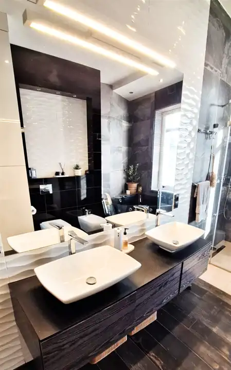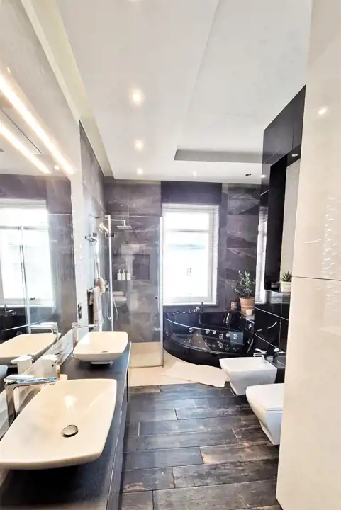 W łazience znajdziemy wannę z hydromasażem, prysznic, podwójne umywalki, bidet oraz toaletę.