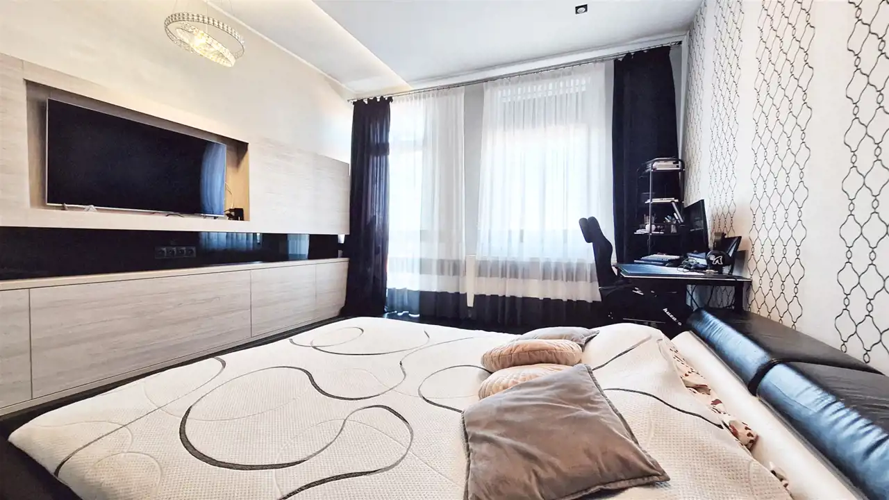 Przestronna sypialnia pomieści bardzo duże łóżko, kącik do pracy oraz wydzieloną garderobę z przesuwnymi drzwiami.