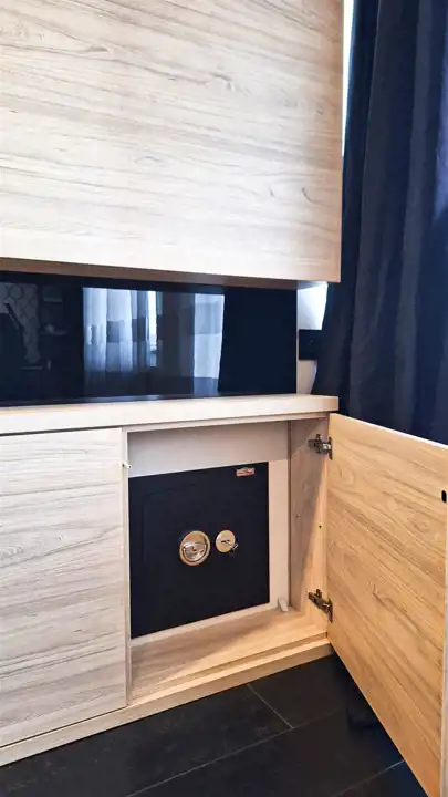Zabudowa w sypialni zapewnia dużo miejsca do przechowywania, ukryty telewizor oraz sejf.