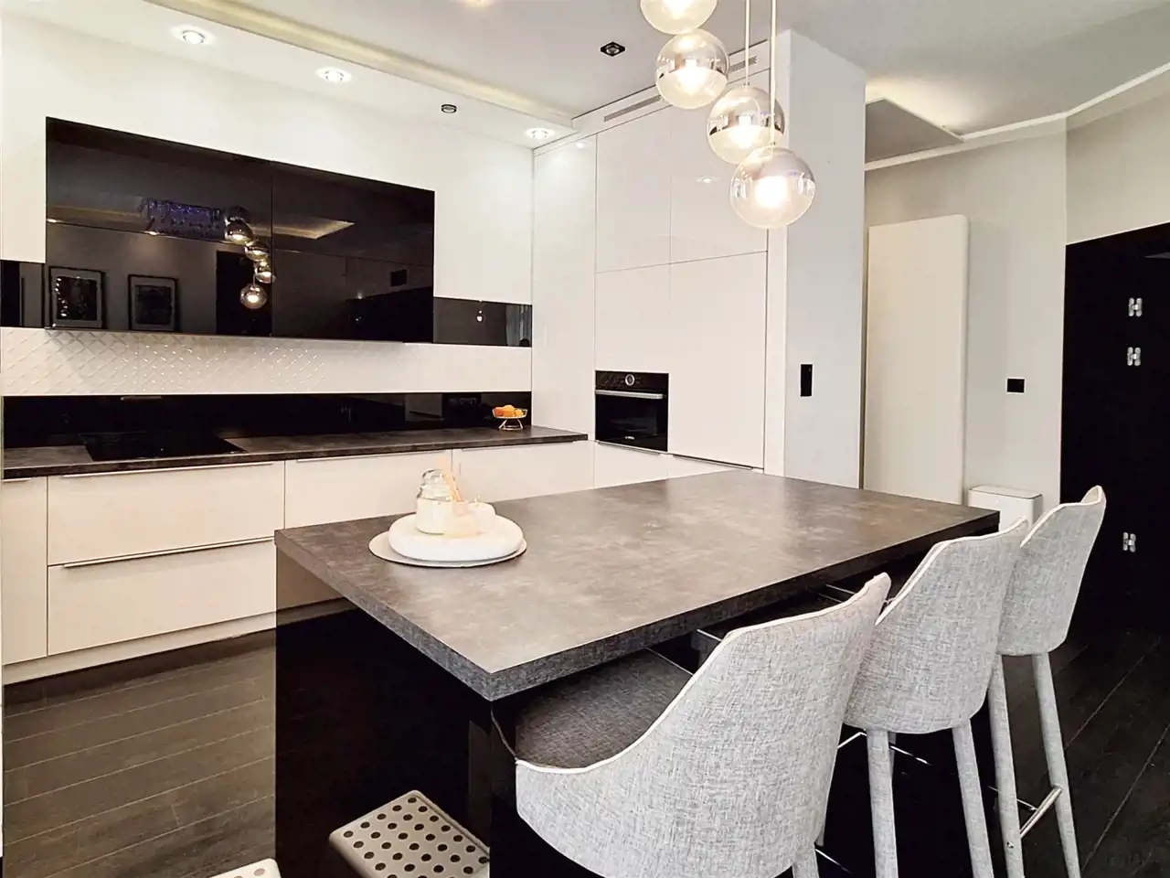 Kuchnia jest wyposażona w najwyższej jakości sprzęty, takie jak piekarnik, zmywarka, lodówka, a nawet winiarka.