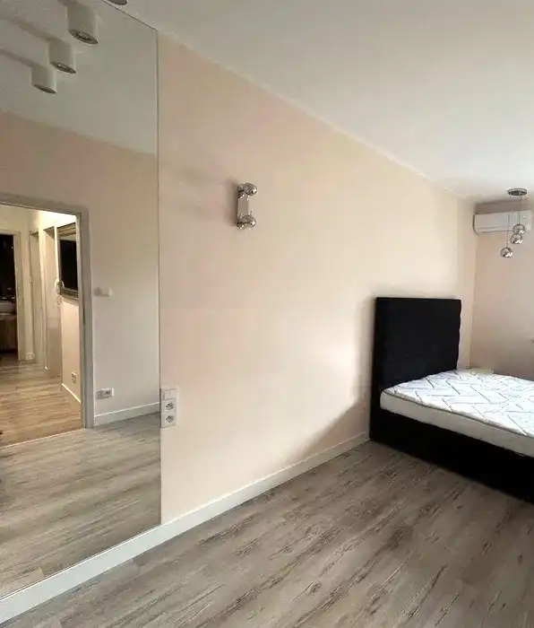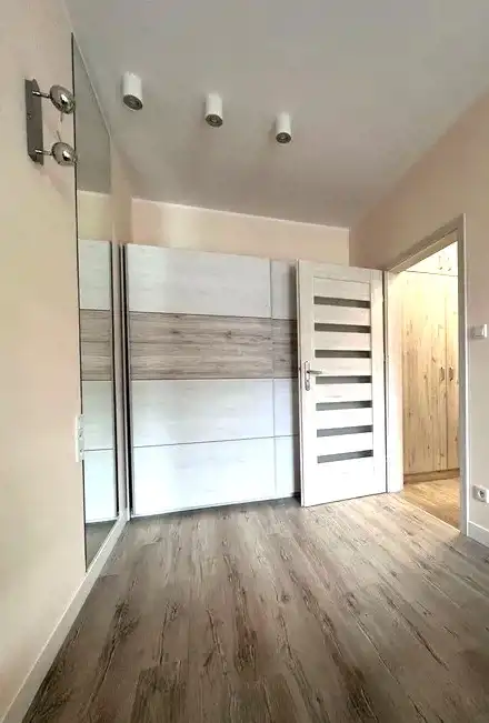 Wnętrza są utrzymane w jasnej, neutralnej kolorystyce, dzięki czemu mieszkanie sprawia wrażenie przestronnego i łatwo dopasować je do własnego stylu. W pokojach znajduje się duże lustro oraz szafa w zabudowie, co dodatkowo zwiększa funkcjonalność przestrzeni.