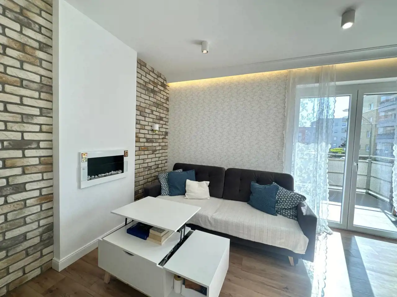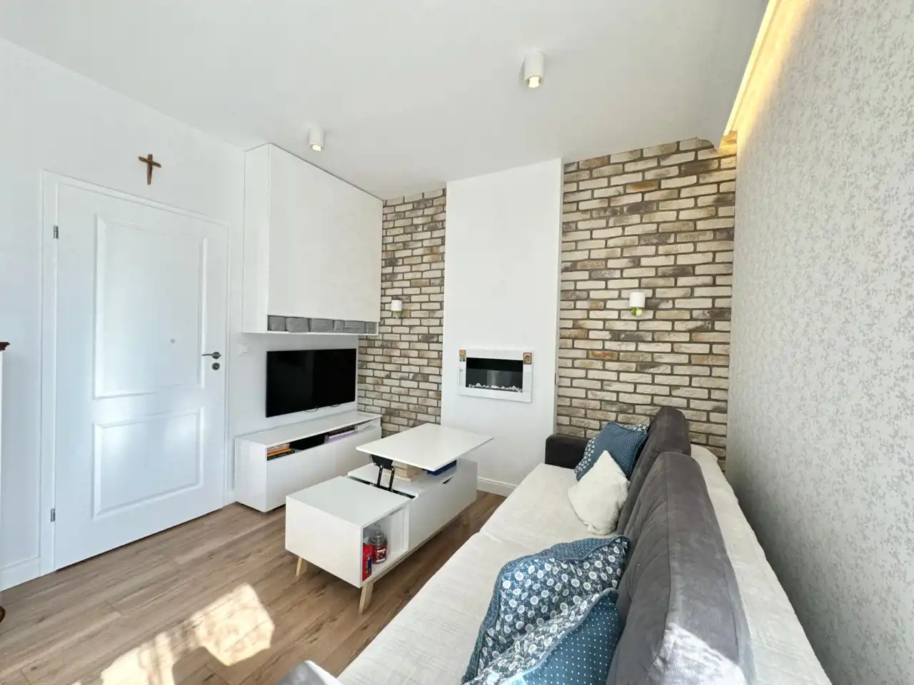 W mieszkaniu zastosowano wiele ładnych rozwiązań, sztukaterię, oświetlenie ledowe, cegłę oraz na całej powierzchni położono panele.