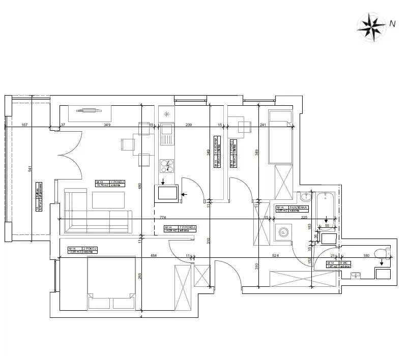 Mieszkanie składa się z pokoju dziennego z aneksem kuchennym i wyjściem na balkon, dwóch sypialni, łazienki, osobnego WC i przedpokoju.