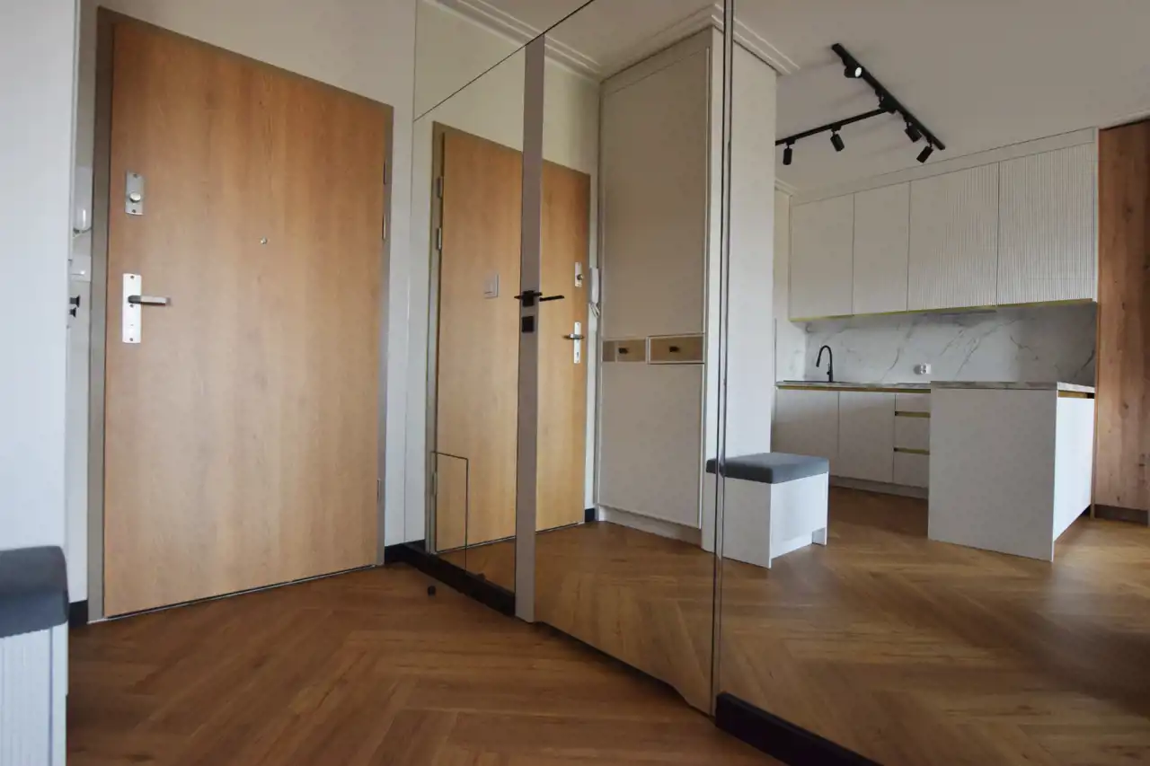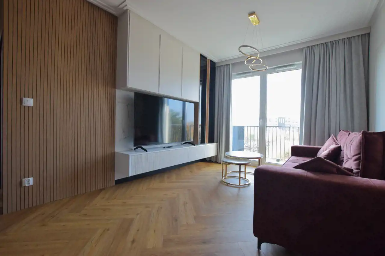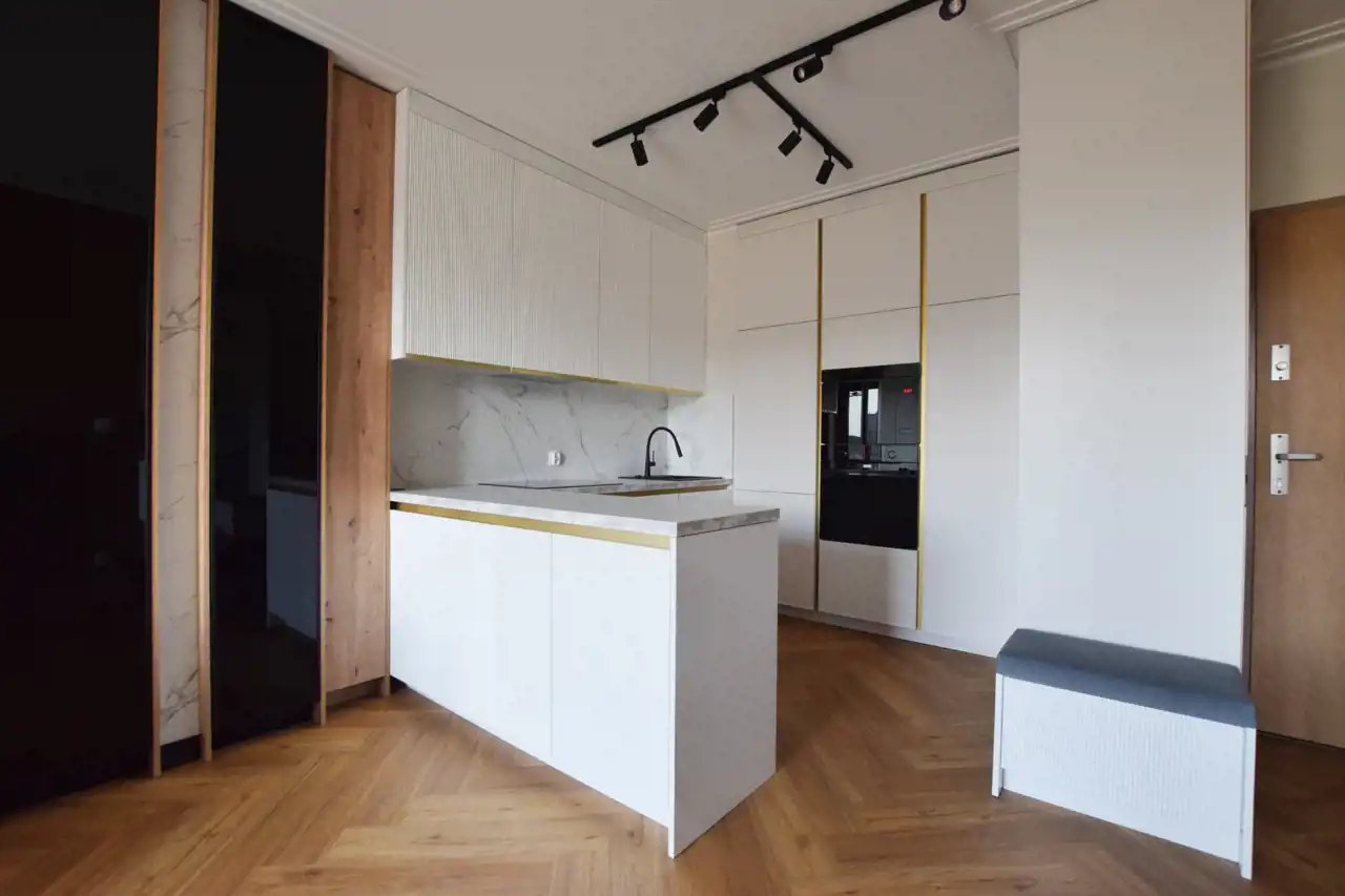W cenie pozostaje: nowoczesna zabudowa kuchenna ze sprzętem AGD, armatura łazienkowa, szafy wnękowe, pełne umeblowanie widoczne na zdjęciach.