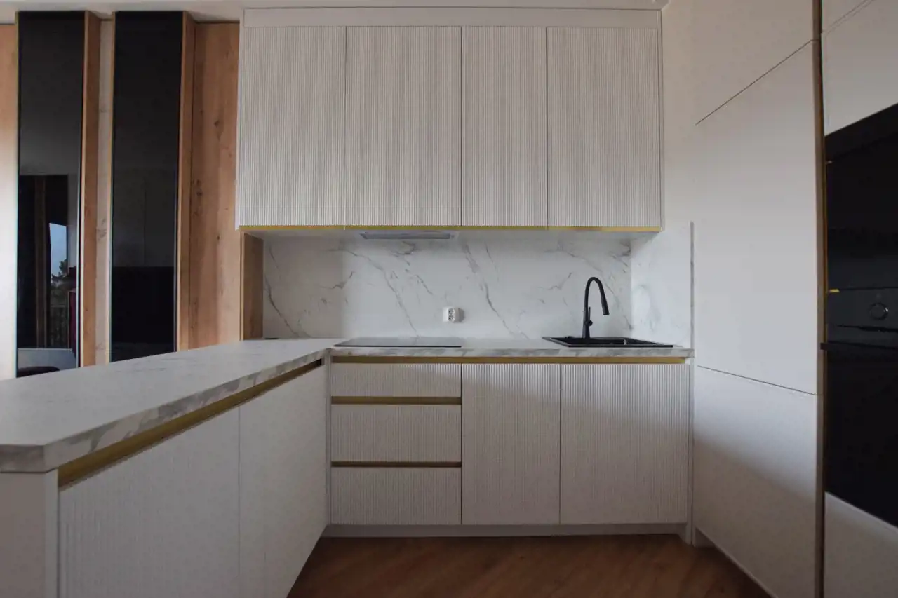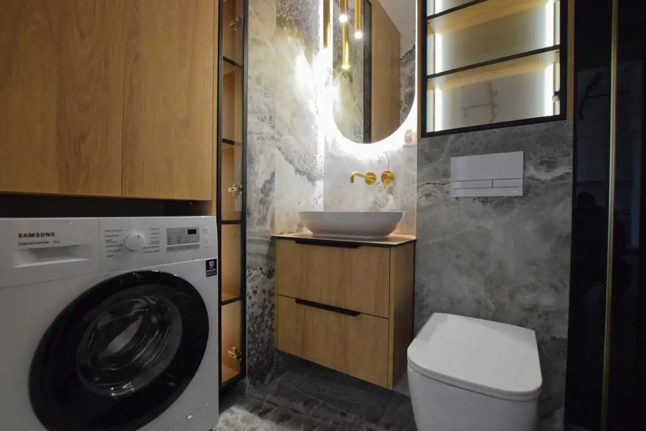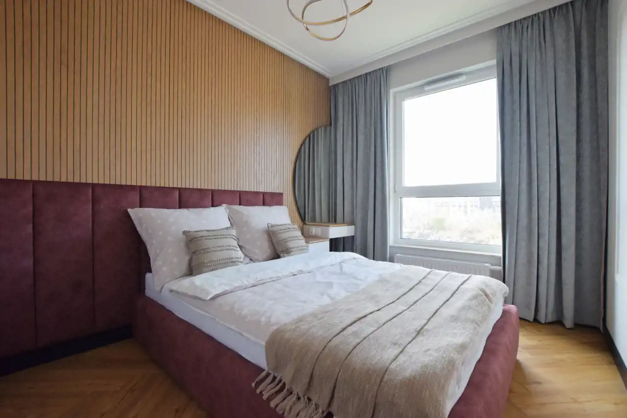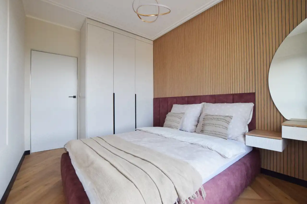 W cenie pozostaje: nowoczesna zabudowa kuchenna ze sprzętem AGD, armatura łazienkowa, szafy wnękowe, pełne umeblowanie widoczne na zdjęciach.