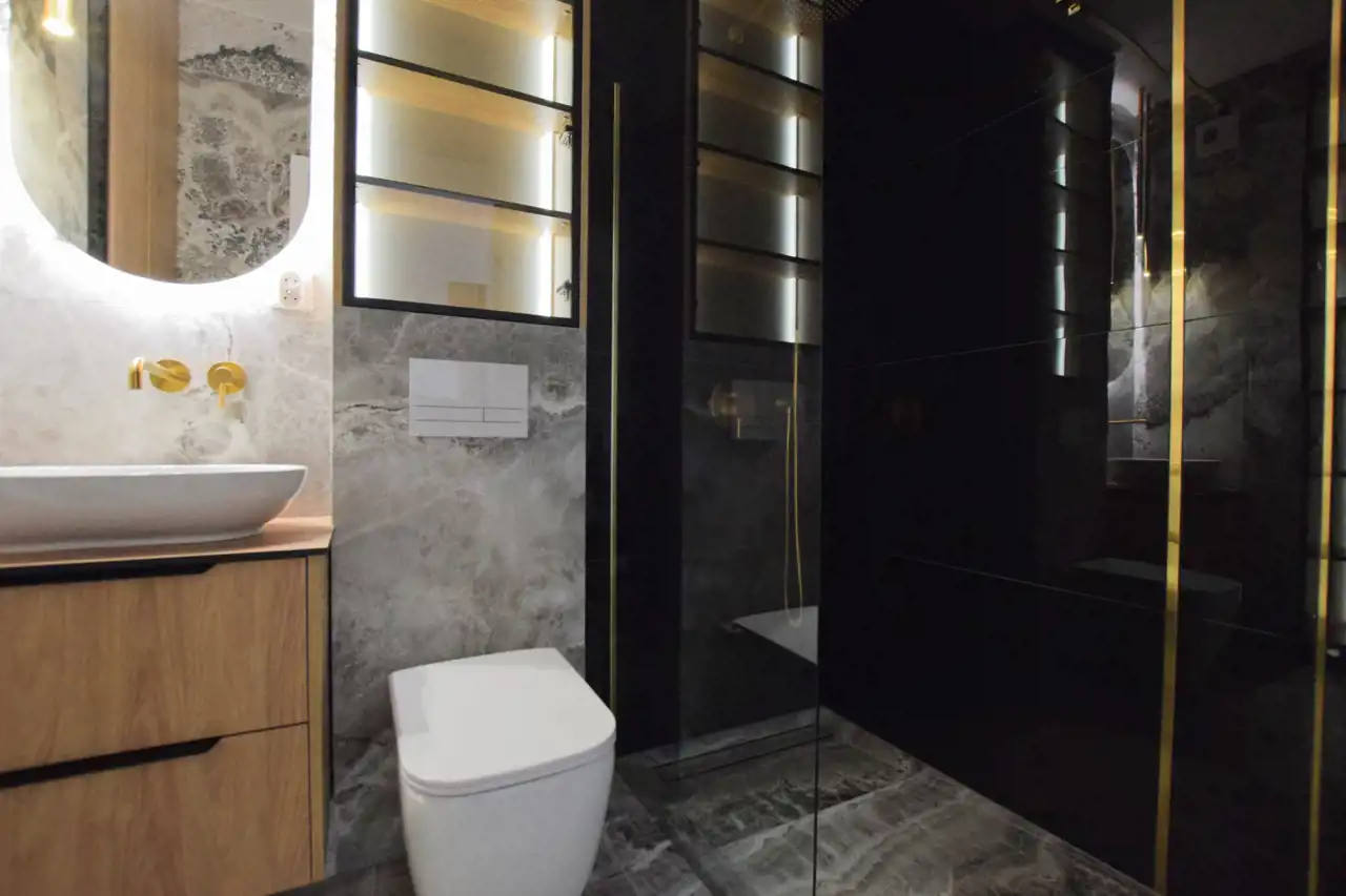 Ściany - gładź gipsowa, sztukaterie, drewniane elementy dekoracyjne, wielkoformatowe płytki ceramiczne w łazience;