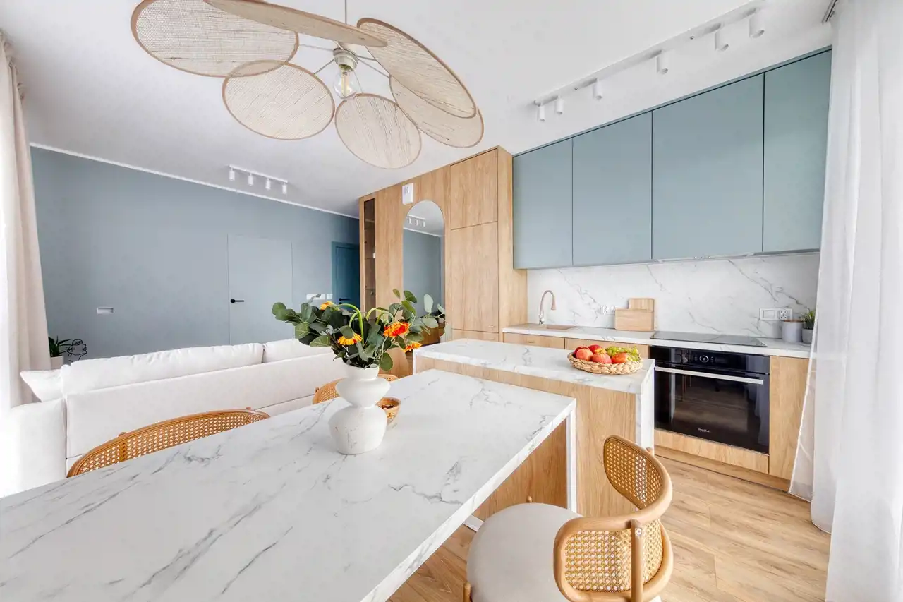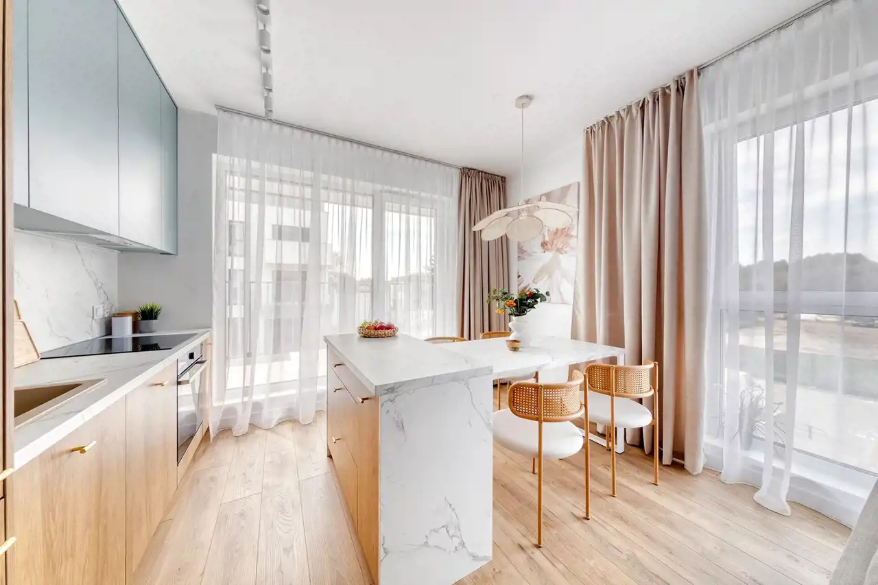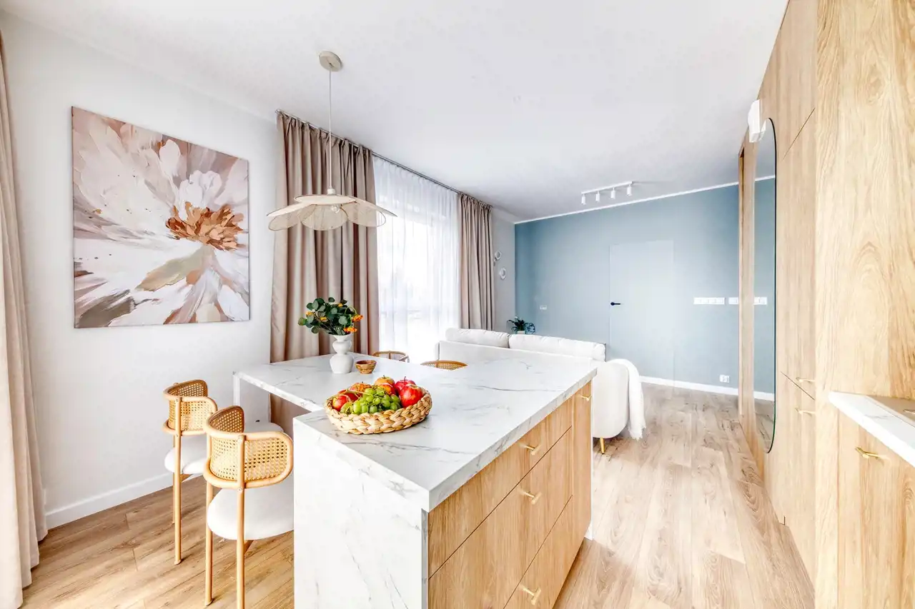 Mieszkanie zostanie wykończone zgodnie z załączoną realizacją w bardzo wysokim standardzie, z dbałością o każdy detal. Wnętrze jest nowoczesne, jasne i harmonijne – dominują naturalne materiały, takie jak drewno i kamień, które nadają przestrzeni przytulnego, a jednocześnie eleganckiego charakteru. Całość tworzy spójny, przemyślany projekt idealny dla osób ceniących estetykę, wygodę i ponadczasowy styl. Kuchnia została zaprojektowana z wykorzystaniem zabudowy meblowej na wymiar, wyposażona jest w wysokiej jakości sprzęt AGD oraz eleganckie blaty z efektem marmuru. Łazienka łączy styl i funkcjonalność – zastosowano tutaj płytki o ciekawym wzorze, designerską armaturę i pojemne szafki. Strefa dzienna z miękką sofą i stonowanymi dodatkami zachwyca ciepłą kolorystyką. Sypialnia z tapicerowanym bezgłowiem i zabudową szaf zapewnia komfort i spokój.